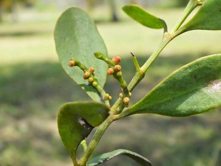 SANTALACEAE=VISCACEAE HEMIPARASITA DE HOJAS OPUESTA VERDADERAS O ESCAMOSAS,FLORES ÉN INFLORESCENCIAS ESPIGADAS CON ENTRENUDOS SIN SEPALOS PERO CON COROLA 3 O 4 PETALOS CON ESTAMBREAS ADNADOS,FRUTAS BAYAS ,LAS SEMILLAS CON MUCÍLAGOS EN PR ESTÁ EL GENERO PHORADENDRON CON 8 ESPECIES,ESTE TIENE HOJAS VERDADERAS SIN ESTÍPULAS.EL GÉNERO DENDROPHTORA CON CUATRO ESPECIES